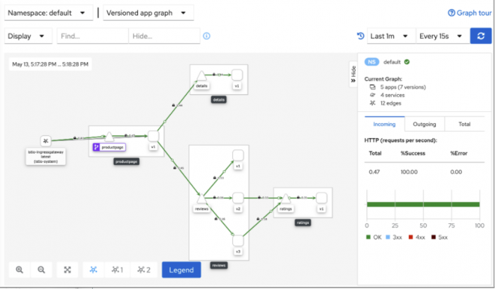 키알리 대시보드에서는 샘플 애플리케이션의 서비스 관계와 메시의 개요를 보여줍니다.